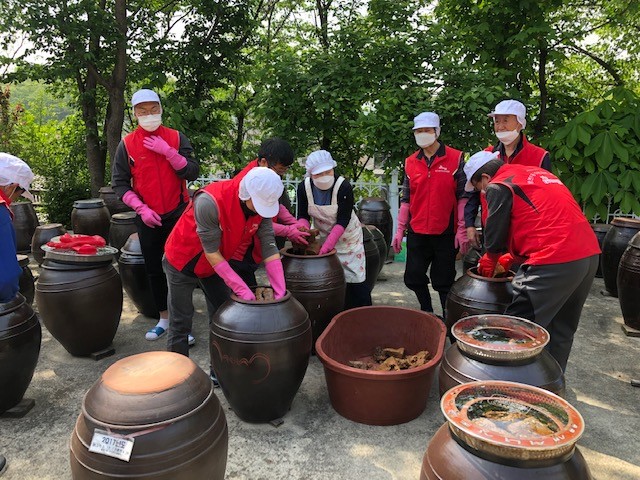 경기 동두천시 생연1동 주민자치위원회가 6일 '전통 장 만들기 사업'의 일환으로 장 가르기 작업을 진행했다. 전통 장 만들기 사업은 메주 띄우기·말리기, 장 담그기·가르기 등의 작업을 거쳐 2년 숙성 후 판매되며, 수익금은 전액 이웃돕기에 사용된다. 사진은 이날 위원들이 장 가르기를 하고 있는 모습. (사진제공=동두천시청)