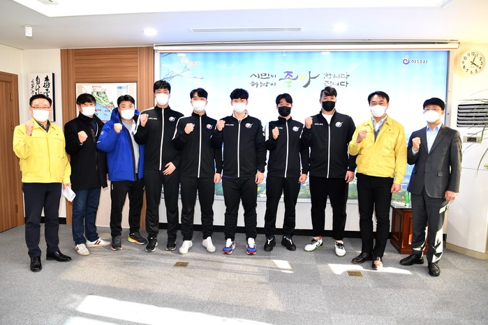 김상호 경기 하남시장이 지난 17일 ‘2020~2021 SK핸드볼코리아리그’에서 인상적인 경기를 펼쳤으나 최종 순위 4위로 리그를 아쉽게 마감한 하남시청 핸드볼선수단을 초청해 격려했다. 사진은 김 시장(오른쪽에서 두 번째)이 선수 및 관계자들과 기념촬영을 하는 모습. (사진제공=하남시청)
