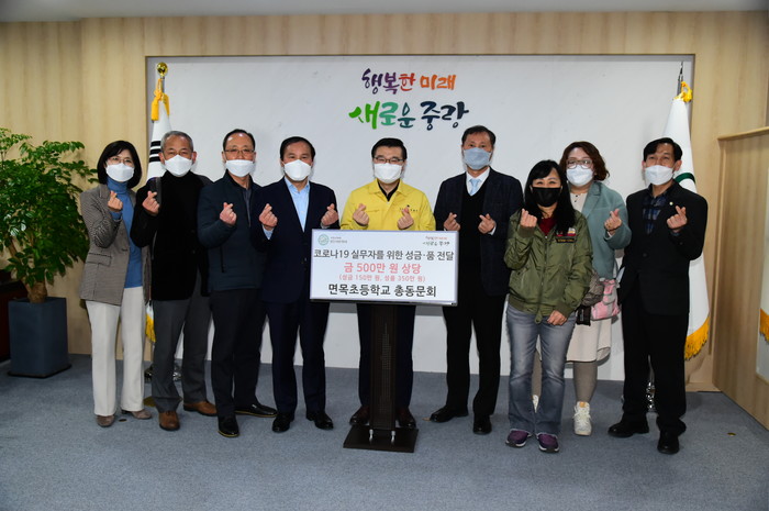 ‘면목초등학교 총동문회’가 지난 16일 코로나19 지역확산 방지를 위해 중랑구에 500만원 상당의 성금·품(성금 150만원, 성품 350만원 상당)을 기탁했다. 사진은 류경기 구청장(가운데)이 동문회원들과 기념촬영을 하는 모습. (사진제공=중랑구청)