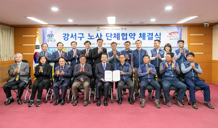 서울 강서구는 5일 구청 대회의실에서 조헌식 지부장을 비롯한 노사 양측 교섭위원 20명이 참석한 가운데 상생협력의 노사관계를 구축하기 위한 협약을 체결했다. 사진은 노현송 구청장(앞줄 왼쪽 다섯 번째)과 위원들이 기념촬영을 하는 모습. (사진제공=강서구청)