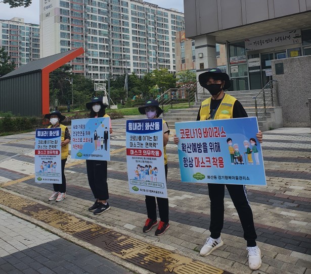 경기 화성시 화산동 경기행복마을관리소가 최근 ‘행복마을만들기’의 일환으로 마스크 착용 생활화 캠페인을 벌였다. 사진은 행복마을지킴이들이 출퇴근 시간에 유동인구가 많은 곳에서 홍보피켓을 활용해 ‘마스크 착용이 최우선의 방역’이라는 메시지를 전달하고 있는 모습. (사진제공=화성시청)