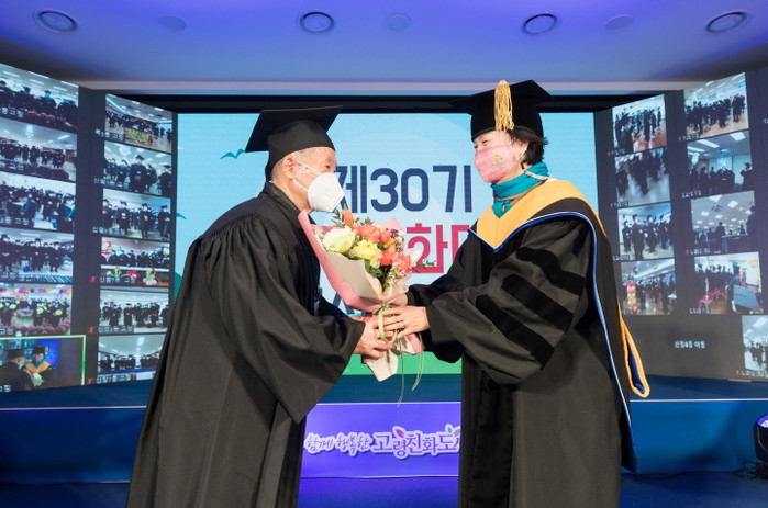 양천구의 '양천장수문화대학'이 최근 온라인 생중계로 수료식을 했다. 수료식은 수료증 수여, 수료사, 30기 장수문화대학 리뷰 등으로 진행됐으며, 모든 과정은 온라인 생중계됐다. 사진은 수료식에서 김수영 구청장(오른쪽)이 수료생에게 꽃다발을 증정하고 있는 모습. (사진제공=양천구청)