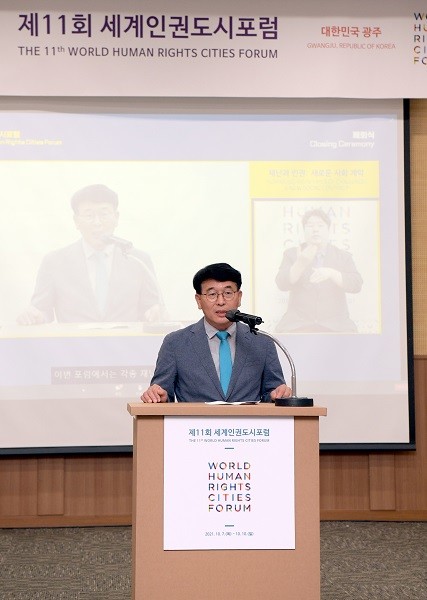 | ▲ 김종효 광주광역시 행정부시장이 10일 오후 김대중컨벤션센터에서 열린 '제11회 세계인권도시포럼' 폐회식에 참석해 폐회사를 하고 있다./광주광역시 제공 |