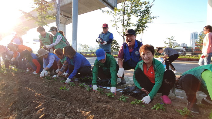 경기 의정부시 의정부2동 주민센터는 17일 아름다운 도시미관 조성을 위한 '캠프 라과디아 녹화사업'을 추진, 캠프 라과디아 3개 구간에 금계국과 피튜니아 모종 4000본을 식재하며 꽃길을 조성했다. 사진은 모종을 식재하고 있는 모습. (사진제공=의정부시청)