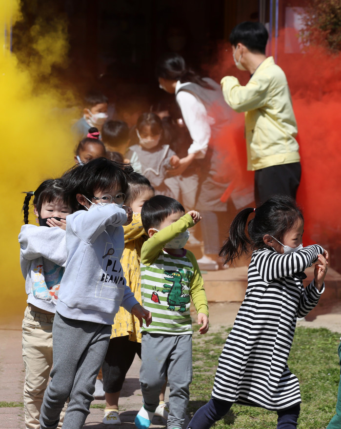 8일 오전 광주 북구 중흥어린이집에서 북구청 민방위팀 직원들이 아이들과 화재대피훈련을 하고 있다. 이 훈련은 세월호 참사 7주기를 일주일 앞두고 어린이들에게 안전에 대한 중요성을 일깨우기 위해 마련됐다.