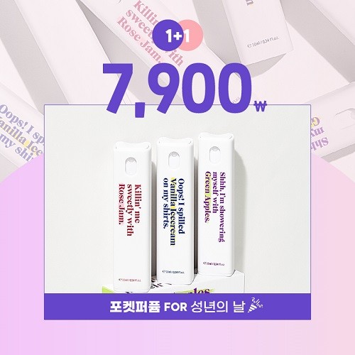 포켓퍼퓸 1+1 프로모션은 성년의 날인 5월 17일 단 하루 동안 원데이즈유 공식 홈페이지를 통해 진행된다. 성년의 날을 기념해 특가인 7900원에 책정됐으며, 무료 배송까지 제공해 합리적인 가격으로 개인 취향에 맞는 2가지 향기의 포켓퍼퓸을 구입할 수 있다.