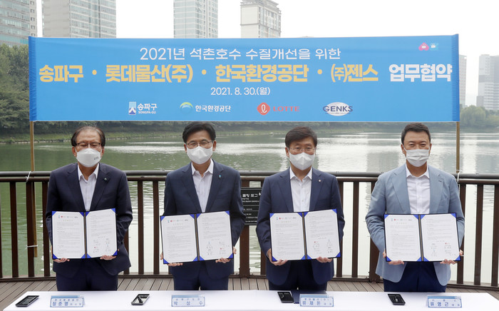 송파구는 지난 30일 롯데·한국환경공단·(주)젠스와 ‘석촌호수 수질개선을 위한 민·관 협력 업무협약식’을 개최했다. 4개 기관은 상호협력을 통해 석촌호수의 수질개선 방안을 찾고, 주민들의 삶의 질을 한층 높인다는 계획이다. 사진은 협약식에서 박성수 구청장(왼쪽 두 번째)과 관계자들이 기념촬영을 하는 모습. (사진제공=송파구청)