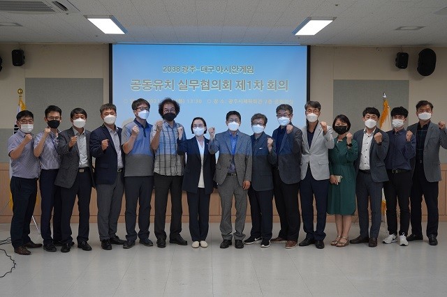 | ▲ 2038 광주·대구 아시안게임 공동유치 실무협의회단, 1차 회의 개최 후 기념촬영 / 사진=광주광역시 제공 |