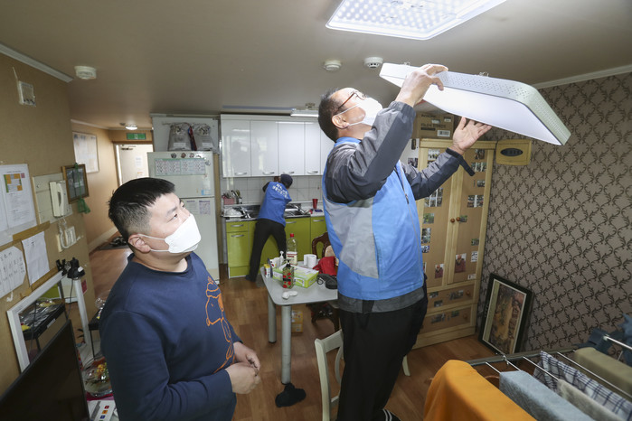서울 성동구는 정부가 사회적 거리두기를 완화함에 따라 21일부터 거동 불편 취약계층의 생활민원을 해결하는 ‘착착성동 생활민원기동대’ 활동을 재개하도록 했다. 사진은 생활민원기동대가 지역내 가구에 방문해 LED 전등을 교체해주고 있는 모습. (사진제공=성동구청)