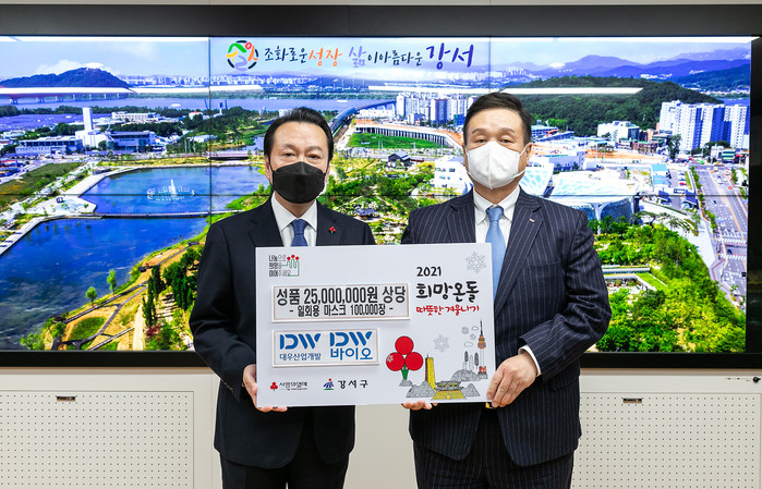 서울 강서구는 18일 대우산업개발(주)로부터 2500만원 상당의 에어데이즈(airdays)마스크 10만장을 기탁받았다. 마스크는 지역내 어르신복지센터 등 사회복지시설에 전달될 예정이다. 사진은 기탁식에서 노현송 구청장(왼쪽)과 박승준 대우산업개발(주) 부회장이 기념촬영을 하고 있는 모습. (사진제공=강서구청)