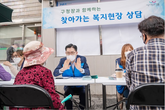 서울 강동구는 최근 성내전통시장에서 복지·취업·주거·마음건강 등 4개 분야에 대한 ‘찾아가는 복지현장상담소’를 운영했다. 이번 상담에는 이정훈 구청장이 명예상담사로 참여해 구정·복지 전반에 대한 주민의견을 청취하고 상담을 진행했다. 사진은 이 구청장(가운데)이 주민 상담을 하고 있는 모습. (사진제공=강동구청)