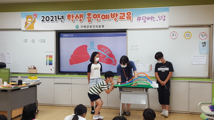 전남 구례군이 최근 지역내 초·중·고등학생을 대상으로 흡연예방교육을 운영했다. 이번 교육은 13개 초·중·고등학교 1480명을 대상으로 강사가 직접 진행하는 대면교육과 각 교실에 비치된 화면을 통해 교육 영상을 시청하는 비대면 교육의 2가지 방식으로 진행됐다. 사진은 초등학교 대상 대면교육에서 학생들이 폐활량 체험을 하는 모습. (사진제공=구례군청)