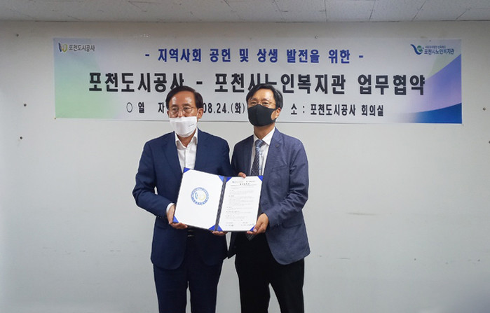 경기 포천시노인복지관 실버인력뱅크는 24일 포천도시공사와 지역사회 저소득층 노인들의 일자리 제공을 위한 업무협약을 체결했다. 양 기관은 협약을 통해 노인들의 경제생활 안정을 도모하고, 지속적인 일거리 마련에 대한 노력과 협력을 약속했다. 사진은 협약식에서 관계자들이 기념촬영을 하는 모습. (사진제공=포천시청)