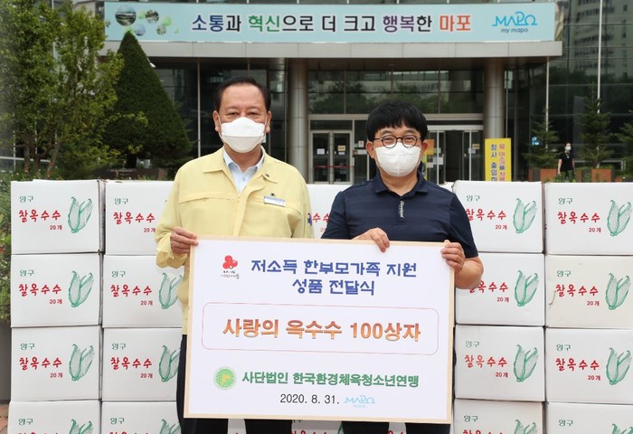 서울 마포구는 지난 8월31일 한국환경체육청소년연맹으로부터 저소득 한부모 가족을 위한 '사랑의 옥수수'를 기탁받았다. 사진은 전달식에서 유동균 구청장(왼쪽)이 관계자와 기념촬영을 하고 있는 모습. (사진제공=마포구청)
