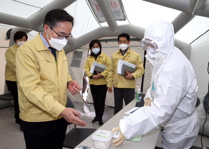 유성훈 서울 금천구청장이 신종 코로나 바이러스 감염증 예방을 위해 최근 독산3동 독산보건분소 선별진료소와 외국인 밀집지역인 남문시장을 방문해 예방수칙을 당부하는 등의 현장행정을 펼쳤다. 사진은 유 구청장(왼쪽)이 독산3동 독산보건분소 선별진료소를 방문해 운영상황을 점검하고 있는 모습. (사진제공=금천구청)