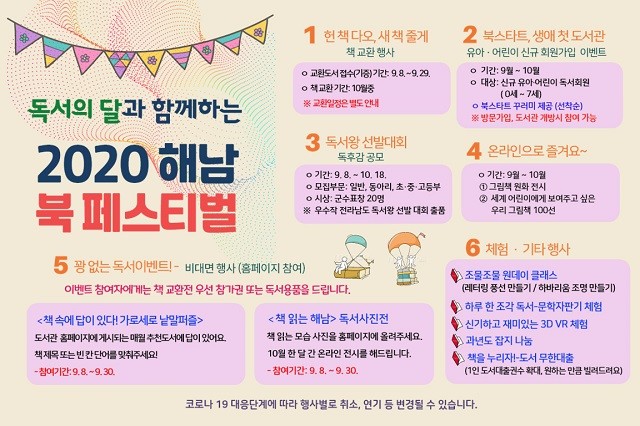 전남 해남군이, 독서의 달을 맞아 ‘2020 해남 북 페스티벌’을 9월과 10월, 2개월 동안 개최키로 했다.