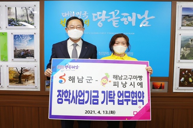 협약에 따라 해남고구마빵피낭시에는 고구마빵 판매수익의 일부를 적립해 해남군 장학사업기금으로 기탁하고 군은 업체의 이미지 마케팅을 위한 홍보 등을 협력해 나가기로 했다. 협약기간은 올해 말까지로 특별한 사유가 없다면 자동 연장된다.