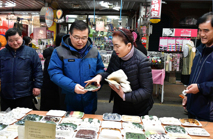 류경기 서울 중랑구청장이 코로나19(우한폐렴)로 침체된 지역상권을 살리기 위해 지난 14일 오후 3시 동원전통종합시장을 방문해 현장 의견을 청취했다. 사진은 류 구청장이 동원전통종합시장에서 물건을 고르고 있는 모습. (사진제공=중랑구청)