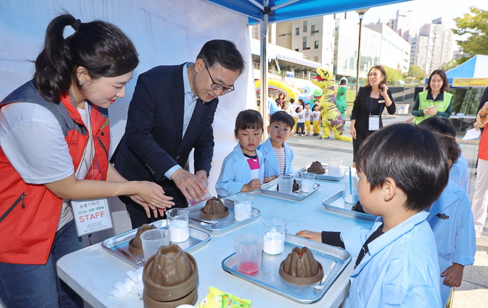 금천구가 30일 오전 10시 구청 광장에서 영유아 및 어린이집을 대상으로 ‘2019 신나는 공룡 대탐험전’을 개최했다. 사진은 공룡대탐험전에 참석한 유성훈 구청장이 아이들과 ‘화산폭발’ 체험을 함께하고 있는 모습. (사진제공=금천구청)