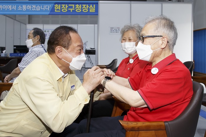 서울 마포구는 코로나19 백신 접종자에게 백신을 맞았다는 사실을 보조적으로 증명하는 형태로 배지를 제공하고 있다. 사진은 17일 유동균 구청장(왼쪽)이 접종을 마친 노인에게 안심배지를 달아주고 있는 모습. (사진제공=마포구청)