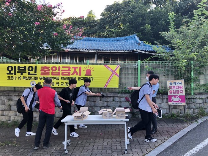 전남 장흥고등학교가 이달 18~21일 실시하는 1학기 기말고사를 맞아 교직원들이 시험공부로 지친 학생들을 격려하기 위해 '1학기 기말고사 아침맞이 행사'를 마련했다. 사진은 교직원들이 등교하는 학생들에게 초콜릿바 등 간식거리를 나눠주고 있는 모습. (사진제공=장흥군청)