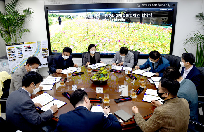 서울 노원구는 최근 롯데백화점·건영옴니백화점·롯데마트(중계점)·홈플러스(중계점)·이마트(월계점)·세이브존·2001아울렛·이마트 트레이더스 등 8개 업소와 ‘지역 일자리 확대를 위한 노원구와 대형유통업체 간 협약식’을 했다. 사진은 협약식에서 오승록 구청장(왼쪽)과 관계자들이 협약서에 서명을 하는 모습. (사진제공=노원구청)