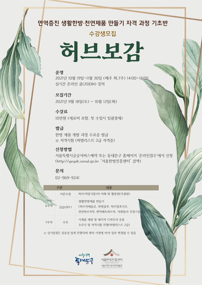 | ▲ 허브보감(약용식물 테라피스트 자격증 과정) 수강생 모집 포스터 (사진제공=동대문구청) |