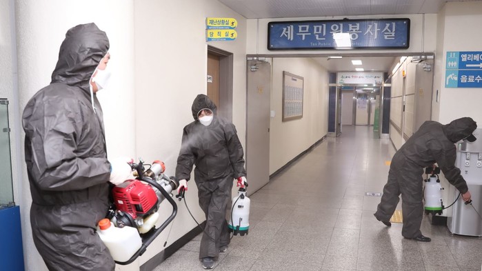 인천 서구는 5일 우한폐렴 확산 방지를 위해 청사 본청의 본관동, 의회동, 별관동을 비롯해 구내식당 등을 대상으로 방역작업을 했다. 또한 제2청사 건물과 임시청사로 사용 중인 세민빌딩에 대해서도 소독작업을 했다. 사진은 방역하는 모습. (사진제공=서구청)