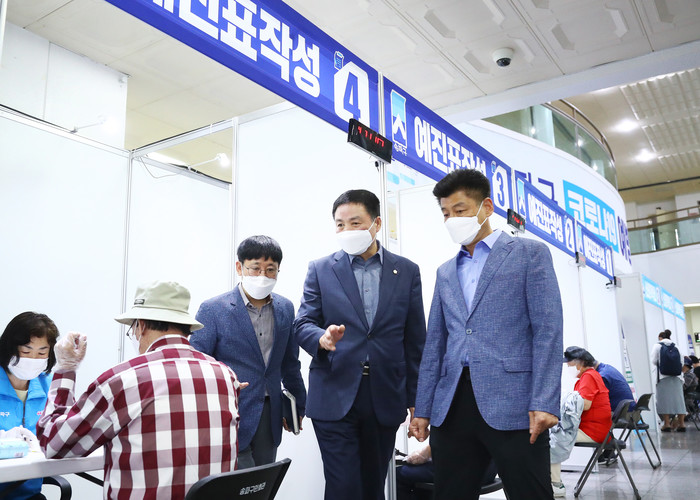 서울 송파구의회가 최근 문을 연 송파구 제2호 코로나19 예방접종센터 송파구민회관을 방문해 의료진과 현장근무자들을 격려하고 접종대상자들을 살피며 예방 접종 운영에 불편함이 없는지 둘러봤다. 사진은 센터를 둘러보는 이황수 의장(가운데)의 모습. (사진제공=송파구의회)