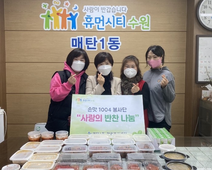 경기 수원시 영통구 매탄1동 ‘손맛1004봉사단’은 25일 매탄1동 행정복지센터에 지역내 취약계층을 위한 직접 만든 반찬을 전달했다. 사진은 전달식에서 봉사단 회원들이 기념촬영을 하는 모습. (사진제공=영통구청)