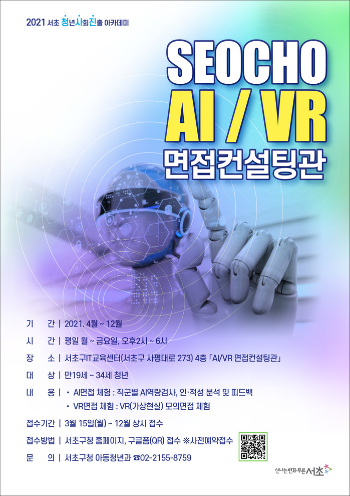 [시민일보 = 이대우 기자] 서초구(구청장 조은희)가 최근 코로나19로 인해 어려워진 청년들의 취헙을 위해 ‘AI·VR면접컨설팅관’의 정식 운영에 들어갔다.
