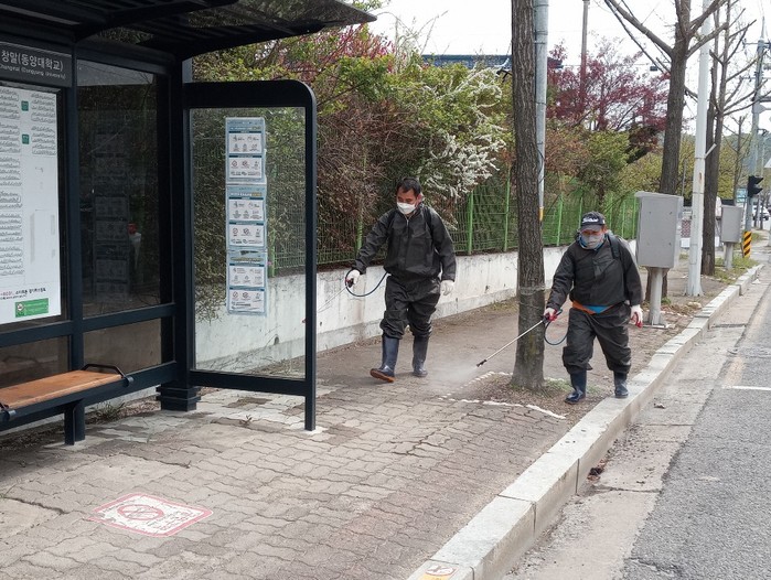 경기 동두천시 소요동 새마을지도자협의회는 22일 지역내 코로나19 확진자가 더 이상 나오지 않도록, 다중이용시설을 중심으로 소독약품을 이용한 방역을 실시했다. 사진은 참여자들이 방역을 진행하는 모습. (사진제공=동두천시청)