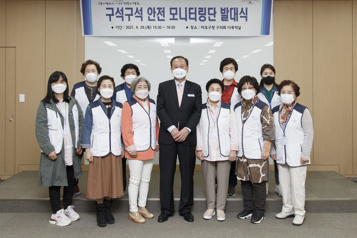 유동균 서울 마포구청장은 29일 여성단체연합회가 골목길의 가로등과 같은 안전시설물의 이상 유무를 살펴보는 '구석구석 안전 모니터링단' 발대식에 참석했다. 사진은 발대식에서 유 구청장(가운데)이 관계자들과 기념촬영을 하는 모습. (사진제공=마포구청)