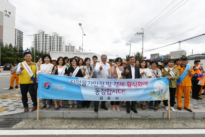 경기 김포시는 최근 '김포 5일장'에서 정하영 시장 및 소비자 시민모임 회원 등 30여명이 참여한 가운데 과일 및 농수산물 등 추석 성수품 물가안정 캠페인을 전개하며 지역농산물 구매, 과소비 자제 등을 당부했다. 사진은 기념촬영을 하는 모습. (사진제공=김포시청)