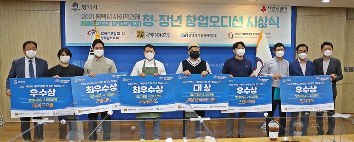 창업오디션은 청장년층의 지속가능한 일자리 창출과 지역사회 공헌 사업 모델 발굴을 목적으로 한국서부발전(주)평택발전본부가 후원하고 평택시가 함께 진행하여 지난 7월 모집공고를 통해 총 31개 팀이 지원했다. 1차 서류심사를 통과한 12개 팀이 지난 8월 31일 ‘창업오디션 대회’에 참여해 6개 팀이 선정됐다. 수상팀들은 올해 12월까지 창업해 2022년까지 (예비)사회적기업, (예비)마을기업, 사회적협동조합으로 인・지정을 받아야 한다.