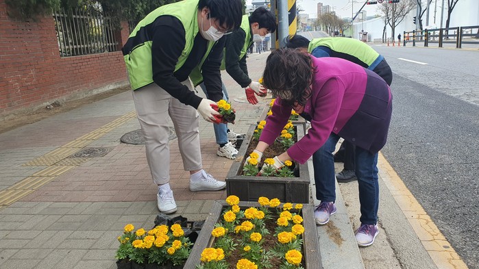 경기 수원시 팔달구 고등동은 22일 봄맞이 가로경관과 골목 환경을 개선하기 위한 초화를 식재했다. 이날 참여자들은 지역내 쓰레기 무단투기가 빈번하게 발생하는 골목과 주민들이 자주 왕래하는 거리 10곳을 선정해 화분을 비치하고, 메리골드 2500본을 식재했다. 사진은 참여자들이 꽃을 심고 있는 모습. (사진제공=팔달구청)