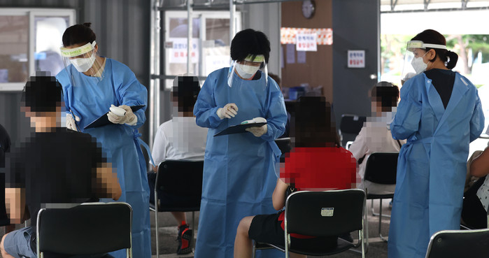 국내 코로나19 신규 확진자가 248명 발생한 31일 오전 성동구보건소에 마련된 선별진료소에서 의료진이 문진하고 있다.