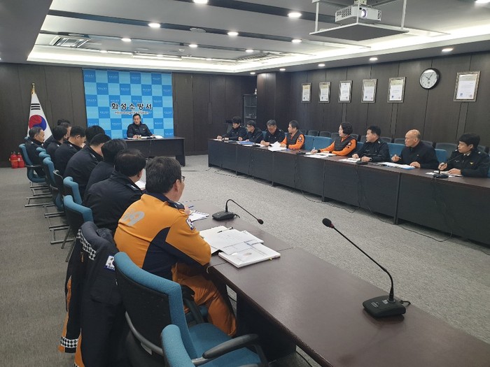 경기 화성소방서는 2일 본서 회의실에서 코로나19 대응체계가 '심각' 단계로 격상되고 지역내 확진자가 급속하게 증가함에 따라 소방공무원에 대한 감염 방지 관리 강화를 위한 대책회의를 했다. 사진은 관계자들이 회의를 하는 모습. (사진제공=화성소방서)