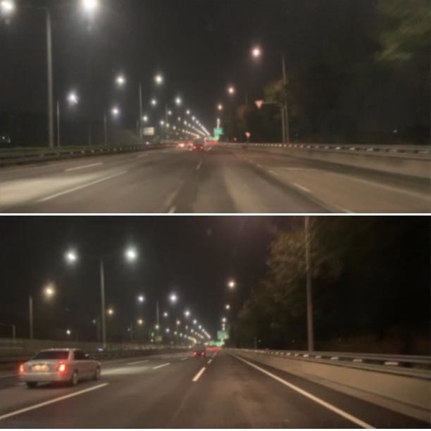 서울시가 밤이나 비가 올 때도 도로 차선이 잘 보이도록 기존보다 최대 3배 밝은 고성능 도료를 내년부터 사용한다고 16일 밝혔다. 사진은 기존 도색(위)과 고성능 도료를 사용한 도색 비교.