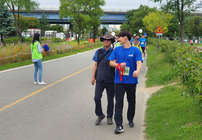 이어 5km 걷기 코스에 참가한 시각장애인과 서로 팔을 묶은 후 이들이 완주할 수 있도록 가이드 러너 역할을 수행했다.