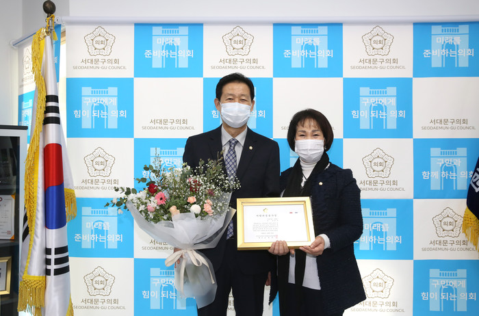 [시민일보 = 홍덕표 기자]서울 서대문구의회(의장 박경희)는 박경희 의장과 유경선 의원이 최근 전국 시군자치구의회의장협의회로부터 '지방의정봉사상'을 수상했다고 7일 밝혔다.