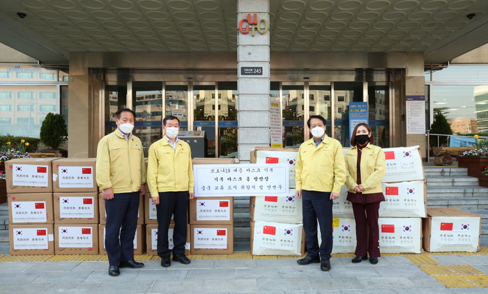 서울 구로구가 최근 중국 광서성 귀항시와 연변조선족자치주로부터 ‘수망상조 한중동심’, ‘풍우동주 환난여공’이란 응원의 메시지가 적혀 있는 마스크 8만장을 기증받았다. 사진은 기증받은 마스크 상자 앞에서 기념촬영을 하고 있는 이성 구청장(오른쪽에서 두 번째)과 관계자들의 모습. (사진제공=구로구청)