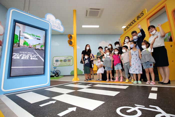 인천 동구는 인천교공원내 위치한 어린이교통안전체험장을 전면 리모델링해 오는 8월3일 문을 연다. 새단장한 체험장에는 ▲횡단보도건너기 체험 ▲스쿨버스 타기 ▲안전벨트 체험 등 다양한 체험 콘텐츠가 갖춰졌다. 사진은 시연회에서 허인환 구청장(뒷줄 오른쪽에서 두 번째)이 어린이들과 함께 건널목 안전교육을 하고 있는 모습. (사진제공=동구청)