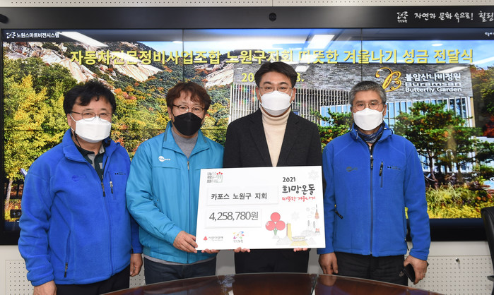 서울 노원구는 최근 서울시 자동차전문정비사업조합 ‘카포스’ 노원구지회로부터 따뜻한 겨울나기 사랑의 성금 약 400만원을 전달받았다. 사진은 전달식에서 오승록 구청장(오른쪽에서 두 번째)와 관계자들이 기념촬영을 하는 모습. (사진제공=노원구청)
