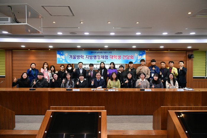 경기 포천시가 3일 '2020 겨울방학 대학생 지방행정 체험'을 마치며 학생들과 소통하는 간담회를 개최했다. 이날 학생들은 느낀점과 시의 발전에 대해 발표했다. 사진은 간담회에 참석한 박윤국 시장(앞줄 가운데)과 학생들의 기념촬영 모습. (사진제공=포천시청)