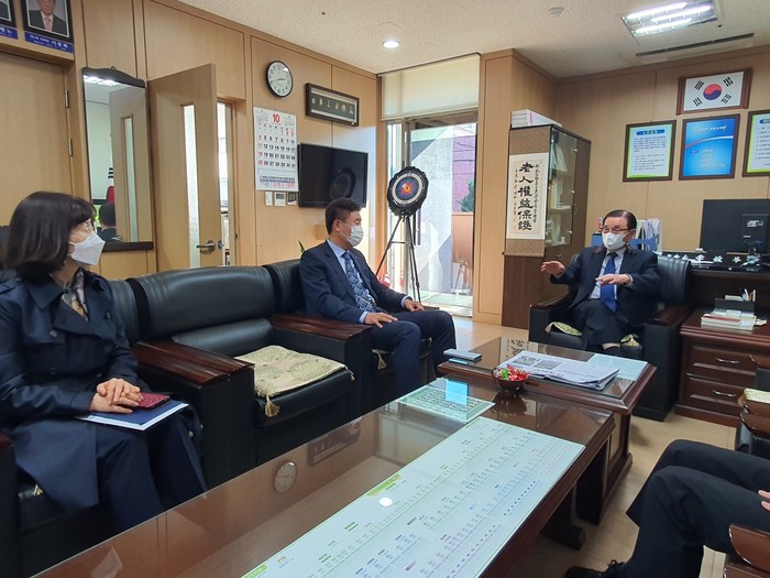 길영배 경기 수원시 권선구청장은 27일 사회적 거리두기 1단계 조정에 따라 운영을 재개한 지역내 155개 경로당 중 군들경로당·벌터경로당 2곳을 방문해 현황을 점검했다. 사진은 길 구청장(왼쪽에서 두 번째)이 경로당 관계자와 대화를 나누고 있는 모습. (사진제공=수원시청)