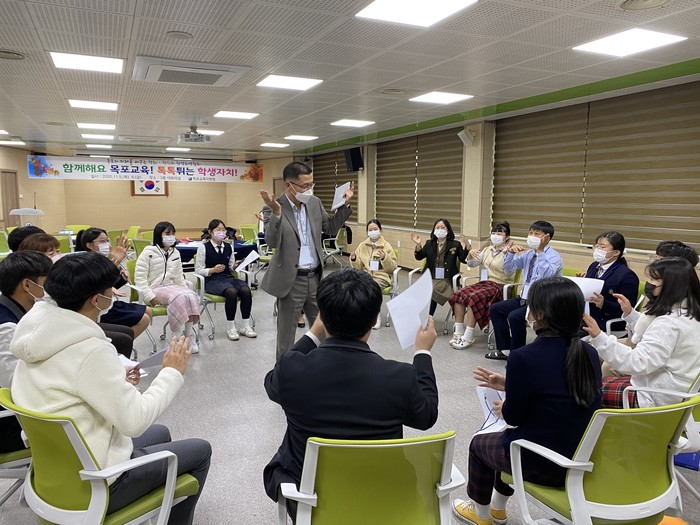 전남 목포교육지원청이 최근 ‘톡톡튀는 학생자치! 함께해요! 목포교육’라는 주제로 목포중·고학생회연합회 회의를 열고 위드 코로나 시대에 맞는 학생회연합회의 활동에 대한 방향과 정책 제언을 중심으로 토의를 진행했다. 사진은 토의 진행 모습. (사진제공=전남 목포교육지원청)