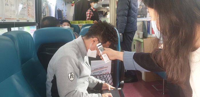 경기 부천시가 동절기 혈액 보유량 감소와 코로나19 확산으로 부족한 혈액을 수급하기 위해 2일 시청 민원실 앞 광장에서 시청 직원 및 시민을 대상으로 '사랑의 헌혈 운동'을 진행했다. 사진은 헌혈 전에 안전을 위해 발열 여부를 확인하고 있는 시청 직원의 모습. (사진제공=부천시청)