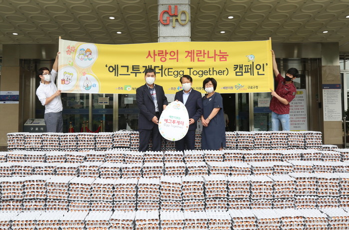 최근 서울 구로구는 계란자조금관리위원회, (사)따뜻한마음의의 후원으로 에그투게더 계란전달식을 진행했다. 이날 전달식에서 기부받은 계란(30구)는 총 1000판으로, 도움이 필요한 주민들에게 배부됐다. 사진은 계란을 전달 받은 후 기념촬영을 하고 있는 이성 구청장(가운데)과 회사 대표들의 모습. (사진제공=구로구청)
