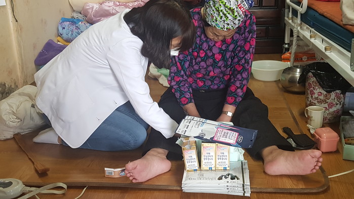 전남 구례군은 치매안심센터 휴관에 따른 돌봄 공백을 최소화하기 위해 만 60세 이상 재가 치매환자에 영양제를 포함한 의약품 2종과 위생소모품 3종 등의 조호물품을 전달하고 있다. 사진은 조호물품을 전달하기 위해 치매환자 가정에 방문한 모습. (사진제공=구례군청)